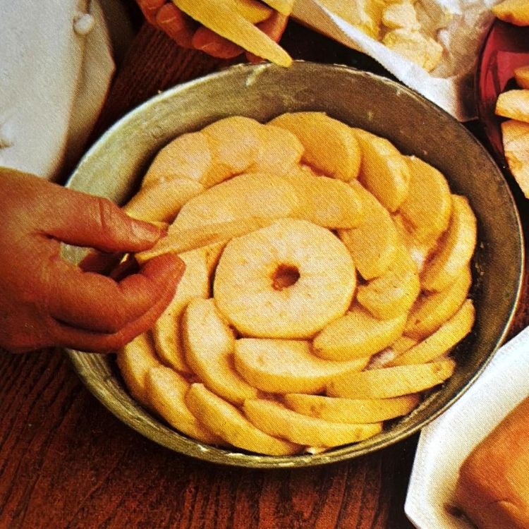 Rangschik de helft van de appelpartjes regelmatig op de bodem van de vorm.