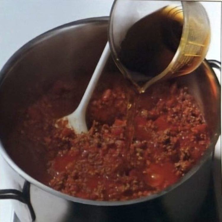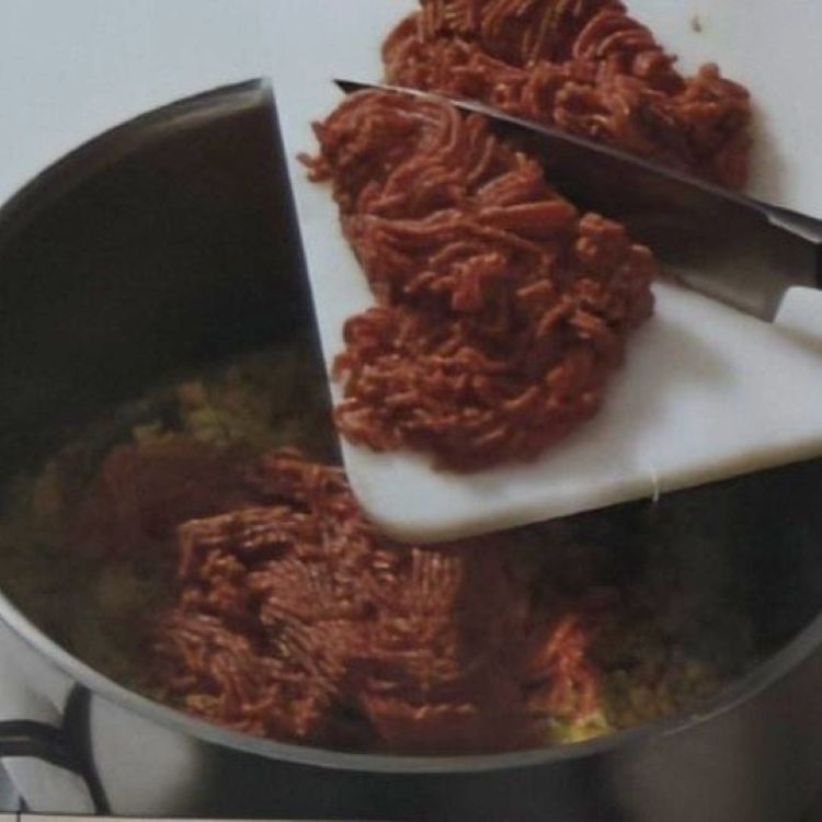Voeg dan 500 gram gemengd gehakt toe en bak dit al roerend op een gemiddelde temperatuur tot het bruin en kruimelig is.